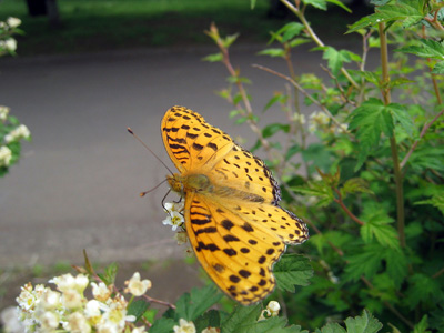 ♀が一頭、しきりに吸蜜していました。裏の模様が特徴的ですが見る事はできませんでしたが、後翅のふちの黒帯がめだつのでツマグロヒョウモンと判断しました。