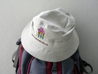 ビジタ−センターで売っていた帽子 ビジターセンターで可愛らしい帽子を売っていました。写真のホワイトバランスが今一つで、実際にはもっとベージュがかった色です。タイ語でヒンガーム国立公園の名前が書かれているそうです。520円くらいの値段でした。 |