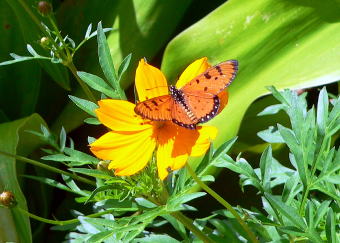 昼食のレストランの庭で見かけた蝶 羽根の表側を見ると雰囲気が違いますが、たぶんカバマダラの仲間ではないかと思います。数頭が黄花コスモスを吸蜜していました。 |