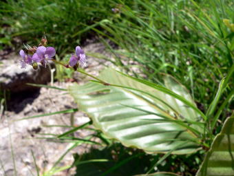 ツユクサの仲間? 何箇所かで紫色の繊細な花を咲かせていました。ちなみに手前の大きな葉は別の植物の葉で、よく見ればわかりますがこの草の葉は細い葉です。 |