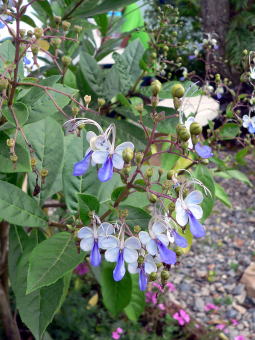 | Clerdodendron ugandense 日本のカリガネソウそっくりな花を昼食のレストランの庭先で見かけました。これは園芸種で、熱帯東アフリカ原産だそうです。匂いをかいでみましたが、カリガネソウのような悪臭は感じませんでした。 |