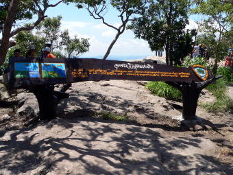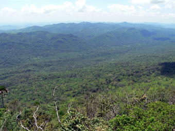| 「地球の果て」から見た風景 高原の端っこの断崖になっている所の説明書きとそこから見た風景です。といってもそんなに大きな落差がある断崖ではないのですが、ジャングルの先まで見通せるのでなかなかの迫力です。説明書きには地下のプレートが押し上げてこの地形が出来たとの説明があるそうですが、地形を大きく捉えて考えるとこの説には疑問が残るそうです。。。といっても私は説明についていけませんでした。 |