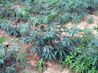 キャッサバ(Cassava) 見慣れない植物を畑作していたので聞いてみた所、キャッサバとのことでした。地理の教科書でおなじみの植物ですが、アメリカ大陸熱帯地域原産のトウダイグサ科の常緑低木です。塊根からタピオカとよばれる良質なデンプンがとれます。2.5mくらいまで成長するようなのでこれはまだ苗の状態なのでしょう。 タピオカは片栗粉として売っていますが、日本で一般的なジャガイモデンプンのものにくらべるとさらっとしています。料理の本なんか見ると、から揚げなんかに使うのが良いんじゃないか、などと書いてありました。 |