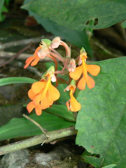 | 地生蘭 2種類→右の花はショウガ科です。 左側は木陰の地面にひっそりと咲いていました。別の花の写真を撮っている時に鮮やかなオレンジが目に付いて近づいてみると綺麗に咲いていました。右側は明るいところに数株顔を出していました。あまりにも花が地面に密着しているので綺麗な花を探すのが大変でした。本当に蘭の仲間か?という気もちょっとしますが、根を掘ってみて確認するような事はしたくなかったのでわかりませんでした。(自然保護) (追伸)左は蘭科でHabenaria rhodocheila Henceと云います。赤から黄色まで花の色は変化に富んでいます。右の花はショウガ科で、Kaempferiaの仲間と思います。 |