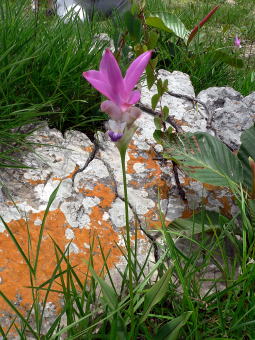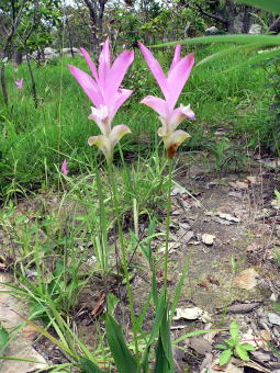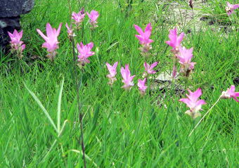 花みょうが Curucuma parviflora 今回の旅行の主役です。群生している所はとても綺麗で、白山でみたハクサンコザクラの群生を思い出しました。少し時期が遅めでしたので綺麗な個体を探すのに苦労しましたが、左上の一株で咲いているものと、右下の2株並んで咲いているものが良い状態でした。群落は規模が大きいのですが、状態の良いところを選んで撮りました。 |