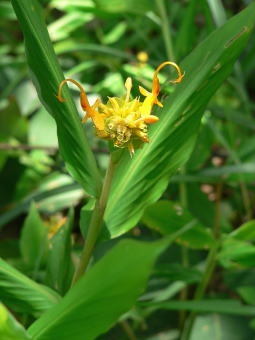| ショウガ科の植物 2種類 左側は岩原の水気の多いところで見かけました。典型的なショウガの仲間の花ですが、なかなか綺麗な花でした。右側は林の下に咲いていました。まだつぼみの株が多かったのですが、咲くとこのような面白い形の花を咲かせます。 |