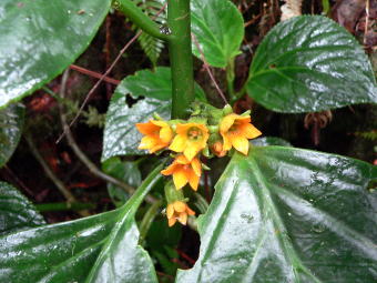 | この花の種類は見当がつきません。 | この黄色い花はかなり暗い所に点々と咲いていました。 | |