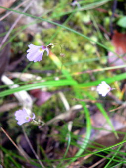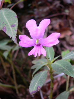 | ここから樹林下で撮影した植物を紹介します。上の花は実際にはとても小さく、苔の上に点々と咲いていました。何の仲間かはよくわかりません。 | ||