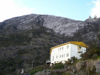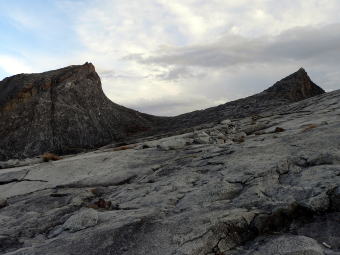 | 左上:朝のロッジからのキナバル山の眺望 右上:ラバンラタ山小屋の下の広場からの展望 左下:St John's Peak(左)(4090m)Low'sPeak(4095m)(右) ご覧の通りの巨大な岩山です。山頂は一つの大きな岩で構成されているかのようです。登山ルート自体はそれほど急ではないのですが、天候次第では大変なことになると思います。 |