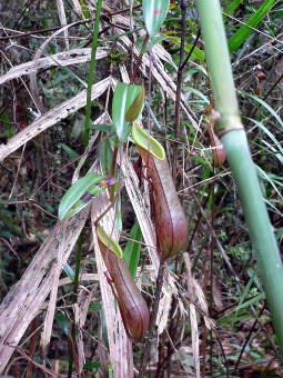 | 今回見たいと思った植物の一つが野生のウツボカズラです。あまり標高の低い所にはなく、ある程度登った所で右下の小型のものが出てきて、その後左上の大型のものの群生地(といってもそんなに沢山あるわけではないのですが)にさしかかりました。ガイドが指差して教えもらった時はその異様な姿にぎょっとしました。ツボの大きさは、20cmくらいに達していたと思います。右上は左上の種類の花で、最初は何の花だろうと思ってよくみたらば、下の方に枯れかけたツボがついていました。右下はやや右上の種類を小型にしたような姿で、一番標高の高いところで見ました。 | ||