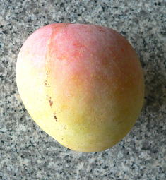| アップルマンゴー 会社の人から貰いました。この種類もそうですが、マンゴーの実の形には、独特の美しさがあると思います。タイ語では女性の頬を意味する名前だそうで、この色合いを見るとよくわかります。食べてみると、身は固めながらも美味しかったです。(かなり大きかったので一個食べるとおなかいっぱいになってしまいますが。 |