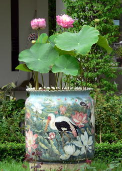 水甕に植えられた蓮の花 今回の主役は蓮ではなくて水甕の方です。描かれているのはPainted Stork(インドトキコウ)です。新しく建てられた建物(タイ語で色々書いてありましたがよくわかりませんでした)の前に置いてありました。この公園はシリキット王妃の名を冠していて、何か由来があるのかもしれません。あまりに見事だったので写真に撮りました。 |