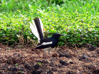 Oriental Magpie-Robin,(シキチョウ) この鳥が繁殖期に入ったのか、雌雄一緒に居るのを何回か見ました。留鳥でよく見かける鳥で、木の枝にとまって美しい声で囀る鳥ですが、今日は驚いたことにリス(Variable Squirrel)を思いっきりモビングしていました。この鳥はBCST(Bird Conservation Society of Thailand http://www.bcst.or.th )のシンボルで、そのシンボルマークそっくりのポーズをとった所を写真に撮りました。数ヶ月前にBCSTの会員になったのですが、事務局に、「日本人の会員の方は居ますか?」とメールで訊いたところ、返事が返ってきませんでした。。。ちなみに会費を払ってからしばらくの間は何の連絡もなかったのですが、最近メールマガジンが来るようになりました。 |