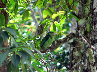 | Moustached Barbet(クロヒゲゴシキドリ) 割と長いことじっとしていたので写真を撮れました。Barbetの仲間は美しい緑色の種類が多いですが、このように保護色になっています。顔も結構愛敬があります。 |