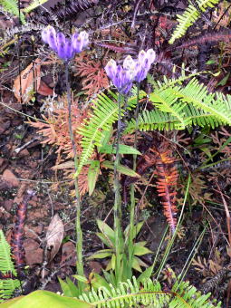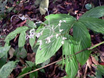 ![]() ショウガ科(Globba属)2種 左の白い花の個体は少しだけ標高の低い所のジャングルの下生えとして群生していました。右の黄色い花の個体は少しだけ標高の高い所で、少し明るい所を好んでいるようでした。もう一種、Caulokaempferia saxicola(黄色い大きな唇弁の花をもつ種類)がありましたが、まさに断崖絶壁の途中にのみあり、全く近づけられませんでした。 |