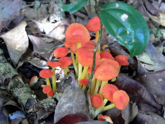 | この白いキノコは木(ジャングルでなくて整備された後に植栽された木)の下の草の間に生えていました | 赤いキノコは樹林下に生えていました。どちらも種類はよくわかりません。 | |