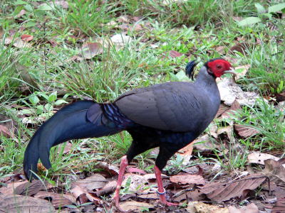 Siamese Fireback(シマハッカン) 姿の通り、キジの仲間の堂々とした姿の鳥です。最初、道路のずいぶん先の方をトコトコ歩いているのを見ました。遠巻きにして観察していたのですが気がついたら接近していて、あまり人を恐れる様子もありませんでした。脚環を着けているので、保護されていた個体かもしれません。ちなみに英名にSiamese(シャムの)と付く鳥はこの鳥だけだったと思います。 |