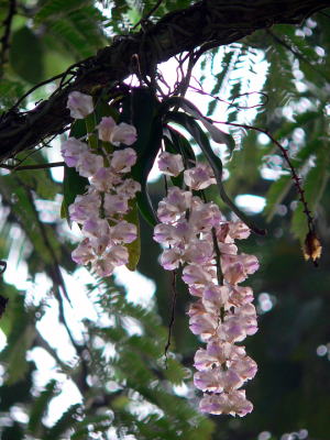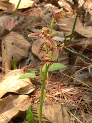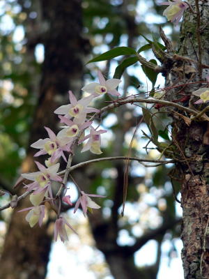 蘭5種 着生蘭はデンドロビウムの仲間と思いますが、細かい種類まではわかりません。国立公園の中でも人気の多い所で見かけたので栄養増殖したものかもしれません。ただし誰の手も届かないような湖の真ん中の立ち木で咲いているのも見かけましたので、野生の個体も存在することになります。生育条件としては広葉樹(地衣類なども好んで着くような木)に好んで着生しています。上の地生蘭の写真の地面にあるように、松の木も多かったのですが、松には着かないようでした。 地生蘭のうち、春蘭に似た花のものは恐らく花が終わったあと葉が伸びるものと思われます。(別のところで見かけた個体は葉が少し出ていました)これは日差しの入る林の下生えとして2個体見かけました。腐生蘭?はタシロランに似ていますがもう少し小柄でした。シャクジョウウソウかと一瞬思いましたが花の造りから見てやはりランの仲間かなと思っています。花を分解したりはしていないので正確なことはわかりません。 |