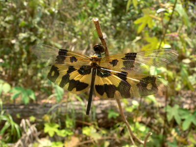 Rhyothemis variegata 派手な羽根の模様のチョウトンボです。このトンボはとてもおとなしく、カメラを相当近づけても逃げようとしませんでした。 |