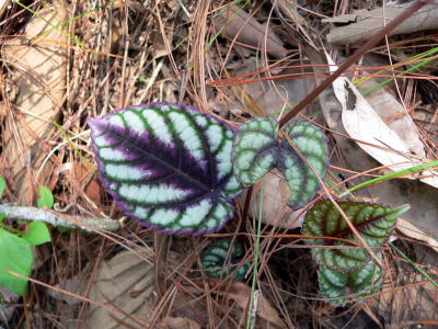 つる性植物 葉の美しい植物です。日差しの入る乾燥気味の林の下生えとしとして見かけました。個体数は多かったです。 |