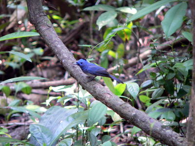 Black-naped Monarch(クロエリヒタキ) 青い鳥、というのが第一印象ですが、図鑑で見ると喉に黒い毛があるのでこういう名前が付いたのではないかと思います。頭や嘴の周辺もちょっと黒い毛が生えていて独特の表情です。 |