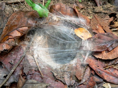 クモの巣? かなり大きな穴で、500円玉くらいの直径はあったと思ます。木の枝でちょっかいを出した人がいましたが、食いついてきませんでしたので、巣の主がどれくらいのものかはわかりません。 |