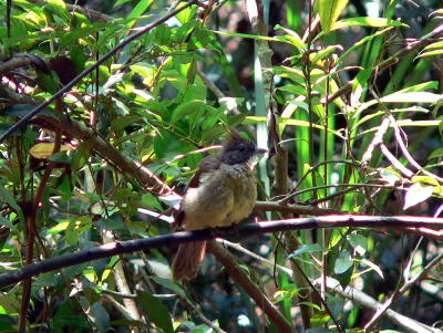 Puff-throated Bulbul (ノドジロカンムリヒヨドリ) この鳥はエボシヒヒヨドリと一緒に現れました。やはりしきりに水浴びを繰り返していました。 |