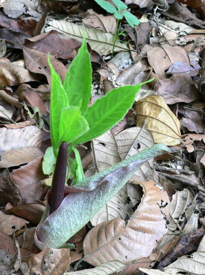 サトイモ科の植物 水場に至る道の途中で咲いていました。一個体だけしか見かけていません。以前、この時期にドイインタノン山に行った際に山頂近くでウラシマソウ(日本のものと見た目は一緒でした)が咲いているのを見たので、ちょうど今がこの仲間の花期かもしれません。 |