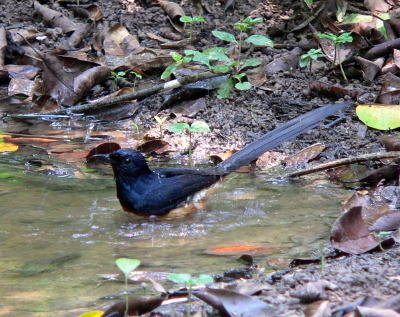 White-rumped Shama (アカハラシキチョウ) この鳥は都会の公園には居ませんが、ゴルフ場などでもよく見かける鳥です。お腹がオレンジ色で、腰のあたりに白い毛が生えているなかなか綺麗な鳥で、鳴き声も良いです。水浴びの真っ最中なので本来の姿はわかりにくいですが、生き生きとした感じの写真となったと思います。 |