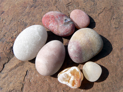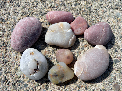 こちらは少し離れた所で拾った石です。左上の卵型の石の黒い斑点は雲母と思います。一番上の石は桃色がとても綺麗でした。 | |