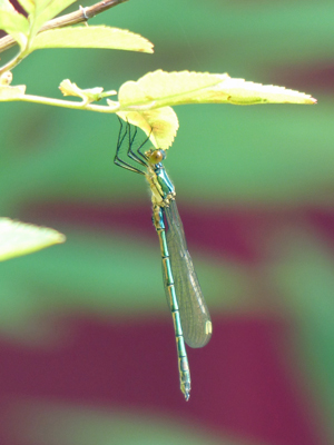 | アオイトトンボ? 日本のアオイトトンボによく似たトンボが居ました。背景の赤い色は民家の壁です。トンボがとまっている辺りも植え込みになっていたので、違う向きから写真を撮ることはできませんでした。 |
