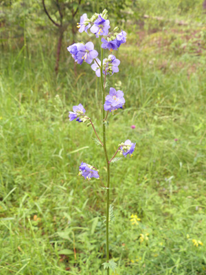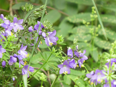 | Polemonium caeruleum ヨーロッパハナシノブ これまで一度だけ草地の端で見ましたが、今回は森の中の空き地(左の写真)と、森のふちの道路の脇(右の写真)で見つけました。以前のものは栽培品の逸出かと思いましたが今回は生えている場所が人の手のはいりにくい所なので野生のものと思います。気温が低かったせいか、今頃が見頃となっていました。 |