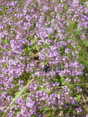 Thymus serpyllum ヨウシュイブキジャコウソウ とても大きな株でした。この写真は群落の一部を撮影したもので、実際はもっと大きなものでした。ここには一頭しか写っていないですが、セイヨウマルハナバチが沢山来ていました。 |