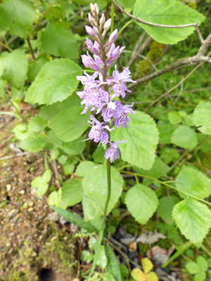 Dactylorhiza fuchsii 先週見たところとは別のところで群生しているのを見つけました。綺麗に咲いていたし、葉の斑点も少し見えます。 |
