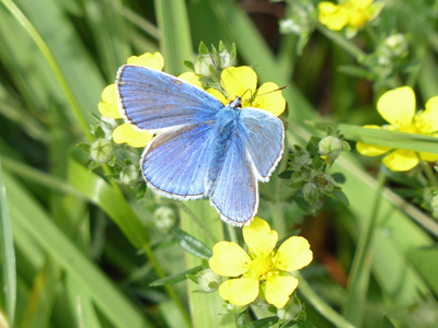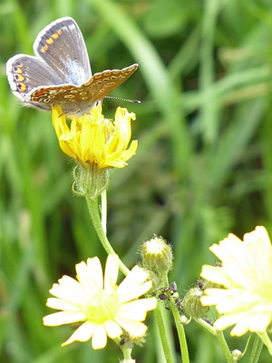 | Plebejus argus ヒメシジミ? この仲間は今年はじめて見ました。これは雌ですが、右の写真の青いシジミチョウはこの種類の雄かもしれません。 |