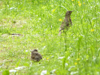 Turdus viscivorus? ヤドリギツグミ 最初、ワキアカツグミかと思いましたが赤みが全くなく、図鑑で調べてこの種類と思いました。成鳥の横に居たには巣立ち雛で、じっとちぢこまっていましたので、遠くからそっと写真を撮ってその場から立ち去りました。。 |
