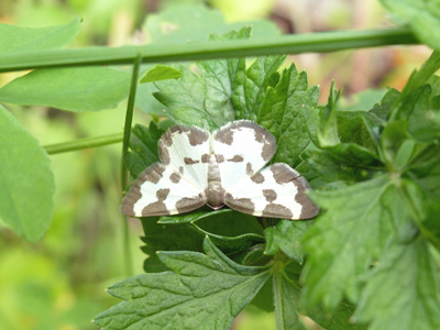 | シャクガの仲間と思われる小さな蛾がいました。模様がなかなか綺麗です。 | ![]() |