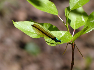 ![]() こちらは森のはずれの道沿いで見たカワトンボです。この仲間は以前青い胴体のものを見ましたが、これは日本で見る種類とよく似ているように思いました。 |