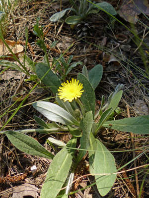 | ハイコウリンタンポポ Hieracium pilosella 日本では帰化植物になっているようです。こちらでは普通の空き地などでは生えているのを見たことはなく、森のふちなどで見ます。鮮やかなレモンイエローの花を咲かせていました。こちらも昨年よりも早いのではないかと思います。 |
