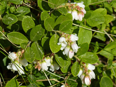 コケモモ Vaccinium vitis-idaeaが咲いていました。これも昨年よりも花期が早いように思います。 | |