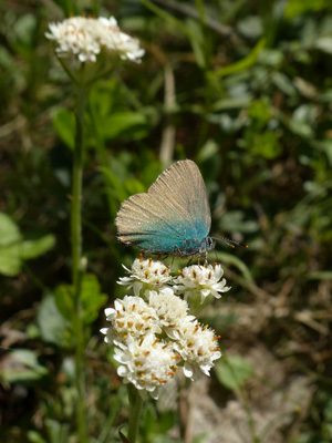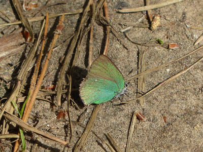 ![]() ヨーロッパミドリコツバメ Callophrys rubi 森の中で沢山飛んでいるのを見ました。左の写真のように地面に降りて太陽に向けて翅を寝かせて日向ぼっこしたり、左の写真のようにエゾノチチコグサ Antennaria dioicaで吸蜜しているのを見ました。それにしてもこの写真だとかなり色が違って見えますが、雌雄の違いなのか構造色の反射の度合の違いなのかよくわからないです。 |