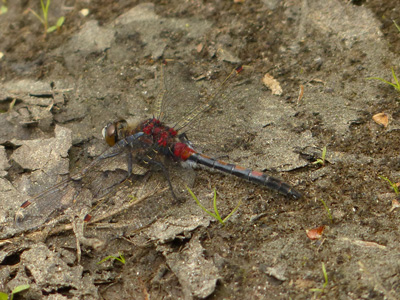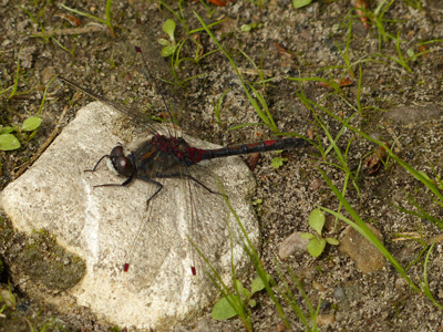 この赤いトンボは先週見たものとたぶん同じですが姿がはっきりと見えました。左の写真だと腹側に毛が生えているのが見えます。 |