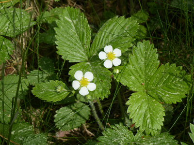 エゾヘビイチゴ Fragaria vesca もあちこちで咲いていました。やはり葉に松の花粉とおもわれる白っぽい粉が付いています。 | |