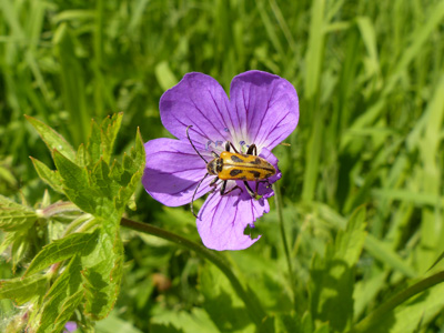 ![]() カミキリムシが近くのフウロにとまっていました。花弁を食べたのはこのカミキリではないような気がしますがどうでしょうか?2年前に同じ種類を見ていますが今回は間近に見る事が出来ました。 |