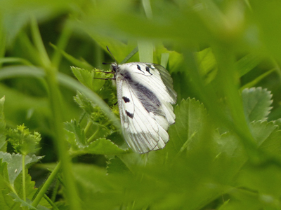 クロホシウスバシロチョウ Parnassius mnemosyne シロチョウのような姿ですがアゲハチョウ科です。とまるとよくわかりますが翅の先が鱗粉がなくて透明になっています。ゆっくりと低空飛行で飛び、時々降りて日向ぼっこするのですがダニが怖くて草原の中まで入る気がせず、近くに降りてくるのを待ちました。 これは草の隙間からかろうじてとまっている姿を撮ったものです。よく見るとハゴロモグサ(Alchemilla vulgaris)を吸蜜していました。 |