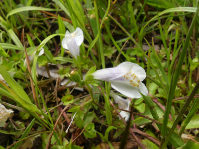 ![]() サギゴケ 紫色のものの方が多かったですが一ヶ所で白花がありました。ただ、よく見ると紫色が少し残っていました。 |