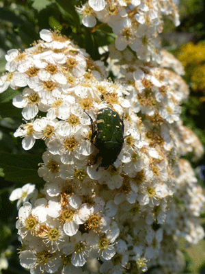 | コアオハナムグリ コデマリの花にひっきりなしに次々と来ていました。(2020/05/02撮影) |