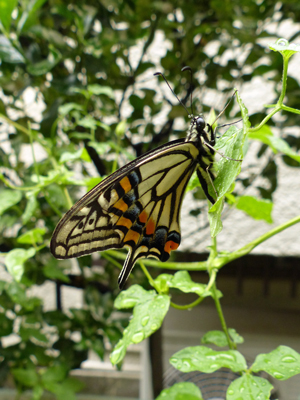 ナミアゲハ 雨がちな天気の中、翅を閉じて休んでいました。アゲハの仲間はこれまでアオスジアゲハ、クロアゲハが来ていましたが、カラスアゲハも庭で見かけたことがあります。(2020/05/04撮影) |