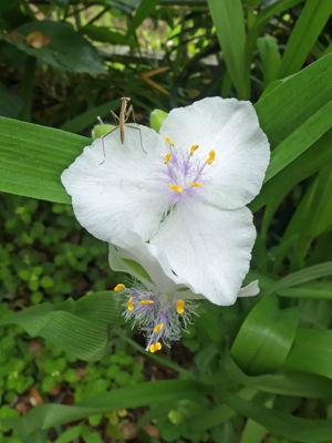 ムラサキツユクサの花の上に孵化したばかりと思われるカマキリの幼虫が居ました。この近くの木に卵があり、それから孵ったものだと思います。(2020/05/18 記)