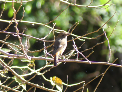 ジョウビタキ 着いてすぐに見たのは♂ですが飛ばれて撮れませんでした。その後少し歩いたらば♀が川沿いの木にとまってくれたので撮りました。家の庭にも少し前に来たことがあります。 |